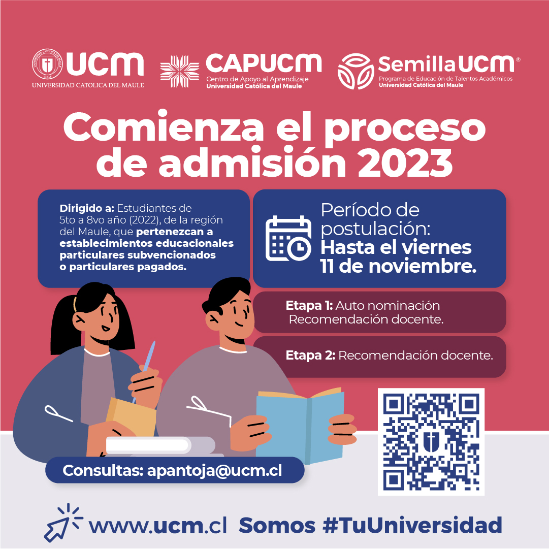 Las postulaciones estarán abiertas hasta el viernes 11 de noviembre. Están convocados los estudiantes de 5to a 8vo año del sistema escolar. El Programa de Educación de Talentos Académicos Semilla, que se desarrolla a través del Centro de Apoyo al Aprendizaje (CAP) de la Universidad Católica del Maule (UCM), comenzó el proceso de admisión para […]